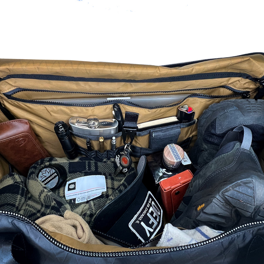 We were going to call it the 'Kitchen Sink', as we feel we've thrown in everything but that. Rover has: A padded computer pocket, the 'surround sound' equivalent of pockets surrounding the bag's interior, more zippers than a zipper factory, removable MIL-SPEC padded straps with Military MOLLE Webbing and more features than we can list here. We set out to DEFY everything we'd ever achieved before and pushed our team to the limit. It wasn't pretty, and the tensions got high. But we broke on through to the other side and have been carrying the Rover on countless trips, smiling from ear to ear and torture testing it along the way. This is the perfect weekender and can go longer than that! One of our main goals was to create a duffel bag where you can easily see all of your things. This was achieved by the bag's unique, broad and deep zipper configuration.